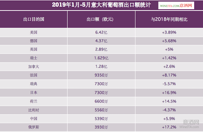 在今年前5個(gè)月意大利葡萄酒的各出口國中,表現(xiàn)最積極的海外市場仍然是美國,其次是德國和英國。在2019年前五個(gè)月,意大利對美國的葡萄酒出口額達(dá)到了6.42億歐元,較2018年同期增加了3.89%。