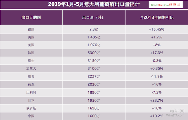 從出口量來看,2019年前5個(gè)月,意大利葡萄酒對德國的出口量最大,達(dá)到2.3億升,較2018年同期增加了15.45%。對美國的出口量為1.485億升,較上一年同期增加了1.7%;對英國的出口量為1.076億升,較上一年同期增加了8%。