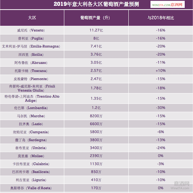 根據(jù)目前的預(yù)測(cè),在所有大區(qū)中,2019年份葡萄酒產(chǎn)量最高的將是威尼托(Veneto)大區(qū),預(yù)計(jì)達(dá)到11.2億升,將比2018年減少16%。第二、第三位依次是普利亞(Puglia)大區(qū)和艾米利亞-羅馬涅(Emilia-Romagna)大區(qū),葡萄酒產(chǎn)量預(yù)計(jì)分別將達(dá)到8億升和7.41億升。