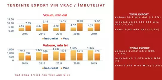 瓶裝葡萄酒的出口總值為13.76億列伊(約5.53億人民幣),與2018年指標持平,而散裝葡萄酒的出口總值下滑至 9.76億列伊(-3.6%)。葡萄酒出口總值為23.52億列伊(-1.9%)。
