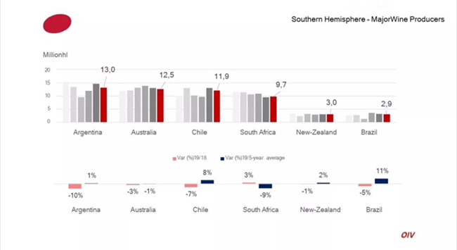 南半球2019年葡萄酒產量為54億升(mhl),占據全球葡萄酒產量的20%,與2008-2018年平均產量持平。