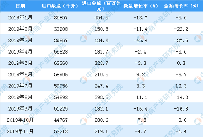 據(jù)中商產(chǎn)業(yè)研究院數(shù)據(jù)庫顯示,2014-2017年中國葡萄酒進口量逐漸增長,2018年中國葡萄酒進口量有所下降;2019年1-11月中國葡萄酒進口量為599355千升,同比下降10.6%。