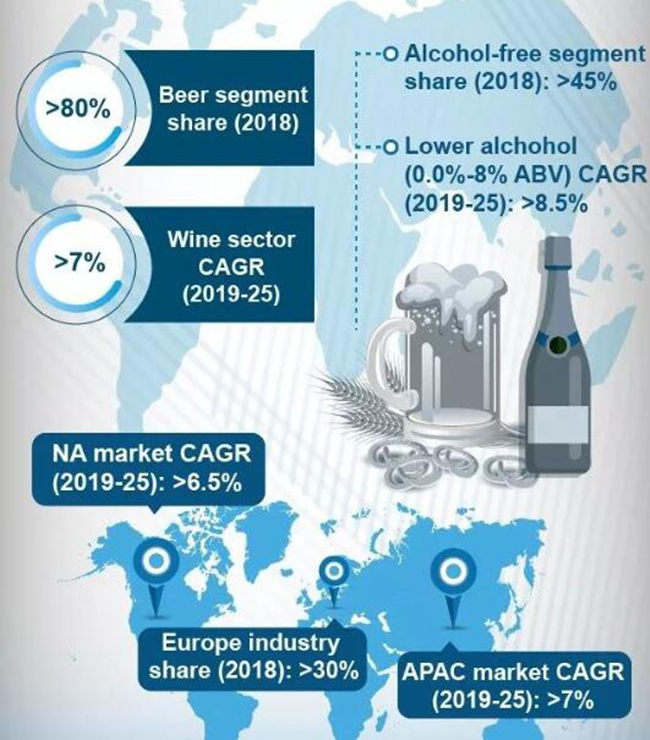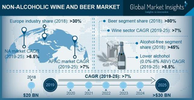 根據全球市場洞察(Global Market Insights)2019年發布的報告,2018年無醇葡萄酒和無醇啤酒市場規模為200億美元,預計從2019年到2025年,年復合增長率將超過7%,達300億美元,以下是部分數據: