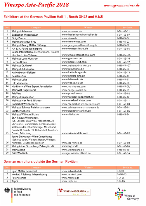 2018 年 5 月 29-31 日,Vinexpo 香港展將在香港會(huì)議展覽中心迎接其第20周年的到來(lái)。在此之際,德國(guó)聯(lián)邦食品和農(nóng)業(yè)部將再次組織德國(guó)展團(tuán)集體參加 Vinexpo香港展,多達(dá) 29 家德國(guó)葡萄酒生產(chǎn)商或酒莊代表將會(huì)出席此次盛會(huì)。