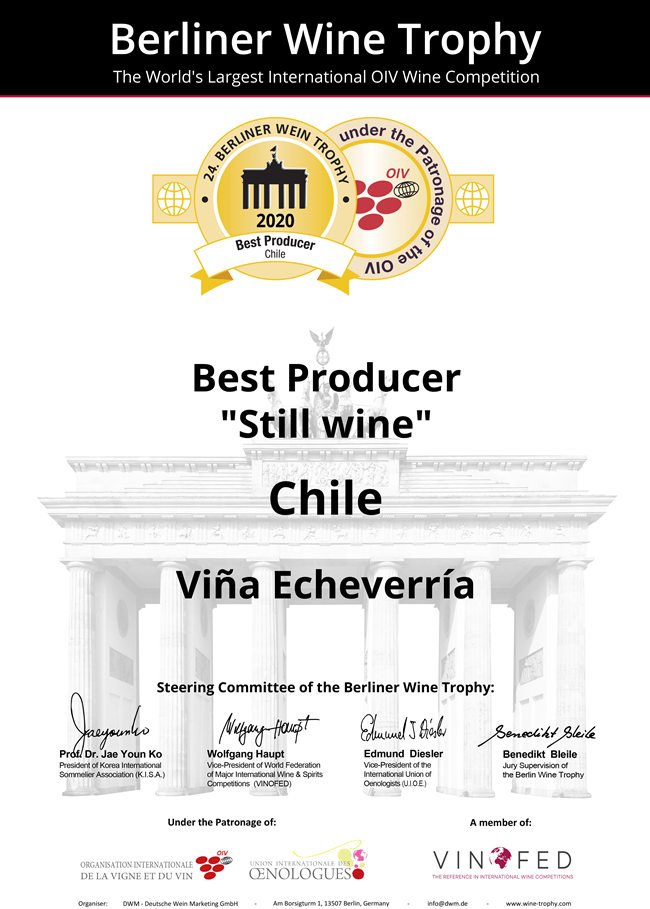 與此同時,智利-安智利雅家族酒莊(Echeverria Family Wines)更是在此項賽事中榮獲了“2020柏林葡萄酒大獎賽-智利最佳生產(chǎn)商”的稱號!其實一切的榮譽都離不開安智利雅家族酒莊自身扎實的發(fā)展戰(zhàn)略,自1700年起,安智利雅家族在智利農(nóng)業(yè)領(lǐng)域始終業(yè)績出眾,20 世紀(jì)初便開始從事葡萄栽植及釀酒行業(yè)。安智利雅家族酒莊更是擁有一個堅不可摧的工作團隊,具有悠久的釀酒傳統(tǒng)與經(jīng)驗,且與環(huán)境和諧共存!其強大的凝聚力來自深邃的家族根基、對釀酒藝術(shù)的共同激情、對完美的不懈追求以及為達到客戶滿意而作出的全身心的投入!