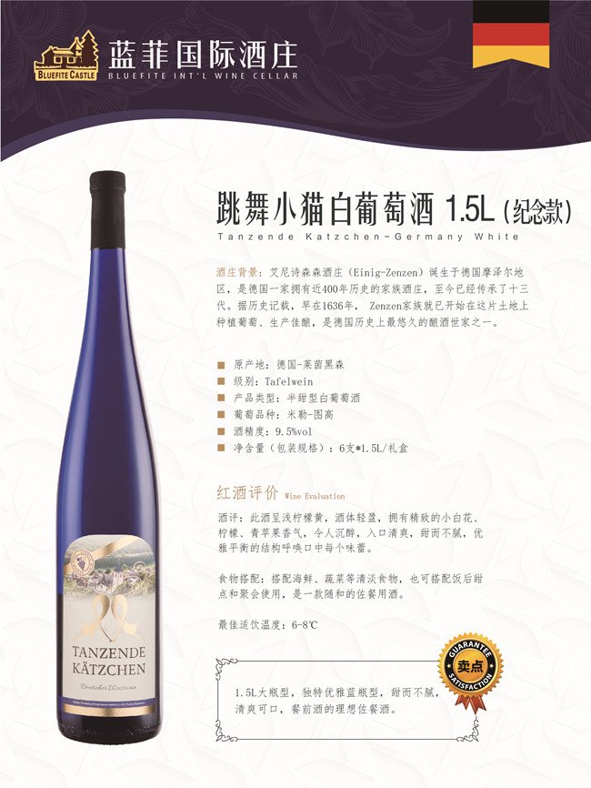 酒體呈淺檸檬黃色,擁有精致的小白花、檸檬、青蘋果香氣,令人沉醉;酒體輕盈,入口清爽,甜而不膩,優(yōu)雅平衡的結構呼喚口中每個味蕾。1.5L大瓶型,獨特優(yōu)雅藍瓶型,最少適合各式各樣的聚會盛典,可搭配海鮮、蔬菜等清淡食物,也可搭配飯后甜點,甜而不膩,清爽可口,是一款隨和的佐餐用酒。
