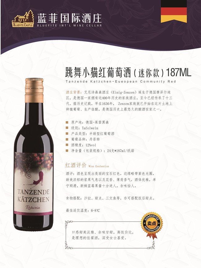 跳舞小貓紅葡萄酒187ml(迷你款),酒色呈現出亮麗的寶石紅色,邊緣略帶紫色光圈;甜美濃郁的漿果氣息以及花香、薄荷香氣;酒體優(yōu)雅,單寧順滑,新鮮藍莓果醬十分迷人,余味怡人??纱钆渖忱?、甜點、三文魚等一起食用,亦可搭配飯后甜點。