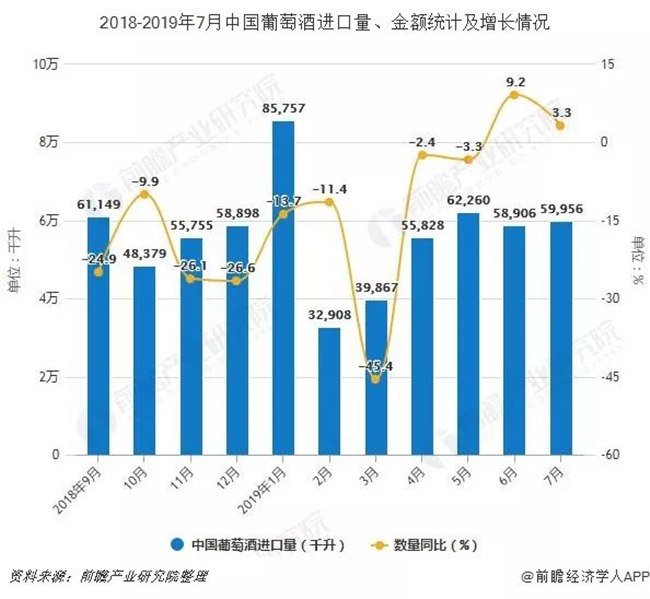 據(jù)中國(guó)海關(guān)總署數(shù)據(jù)顯示,2019年1-2季度中國(guó)葡萄酒進(jìn)口量有所增長(zhǎng),2019年7月中國(guó)葡萄酒進(jìn)口量為59956千升,同比增長(zhǎng)3.3%。累計(jì)方面,2019年1-7月中國(guó)葡萄酒進(jìn)口量達(dá)到395429千升,同比下降10.8%。